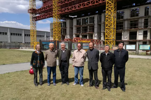 中國房地產業協會名譽副會長童悅仲(左三)等參觀用“空中造樓機”建造的住宅。