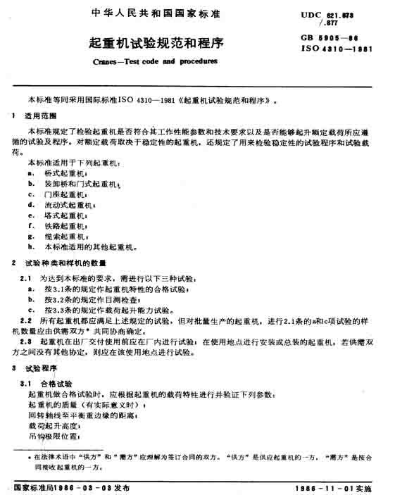 GB/T5905-1986 起重機試驗規范和程序